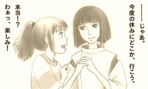 ![]() *小説「電車に乗って」の挿絵をいただきました!!* 阿優みいさまのイラストに挿し文「電車に乗って」を書きましたら、なんと、その小説に、阿優みいさまがさらに挿絵を描いてくださいました!!!!! う〜〜〜う〜〜〜嬉しい〜〜〜!!! 小説のちょうど、真ん中、(2)のラストシーンです。 この優しいセピア色の世界!!これですよ、これ! 意識を失う寸前のハクの瞼をかすめた、大事な大事な記憶のかけらは!!!! この約束が傷ついたハクを最後の一線で支えてくれたんですよ〜〜!! 文では表現しきれなかったところを、みごとに映像にしてくださった、阿優みいさまの画力に感動です。ほんとうにありがとうございました!! なお、阿優みいさまのサイトでは、このイラストの「スノーテイストバージョン」と「フルカラーバージョン」が展示されています。 リンク部屋からいけますので、ぜひ!(「油屋ツアー 3泊4日」の「ボイラー室」の「本当!?」という作品です) |